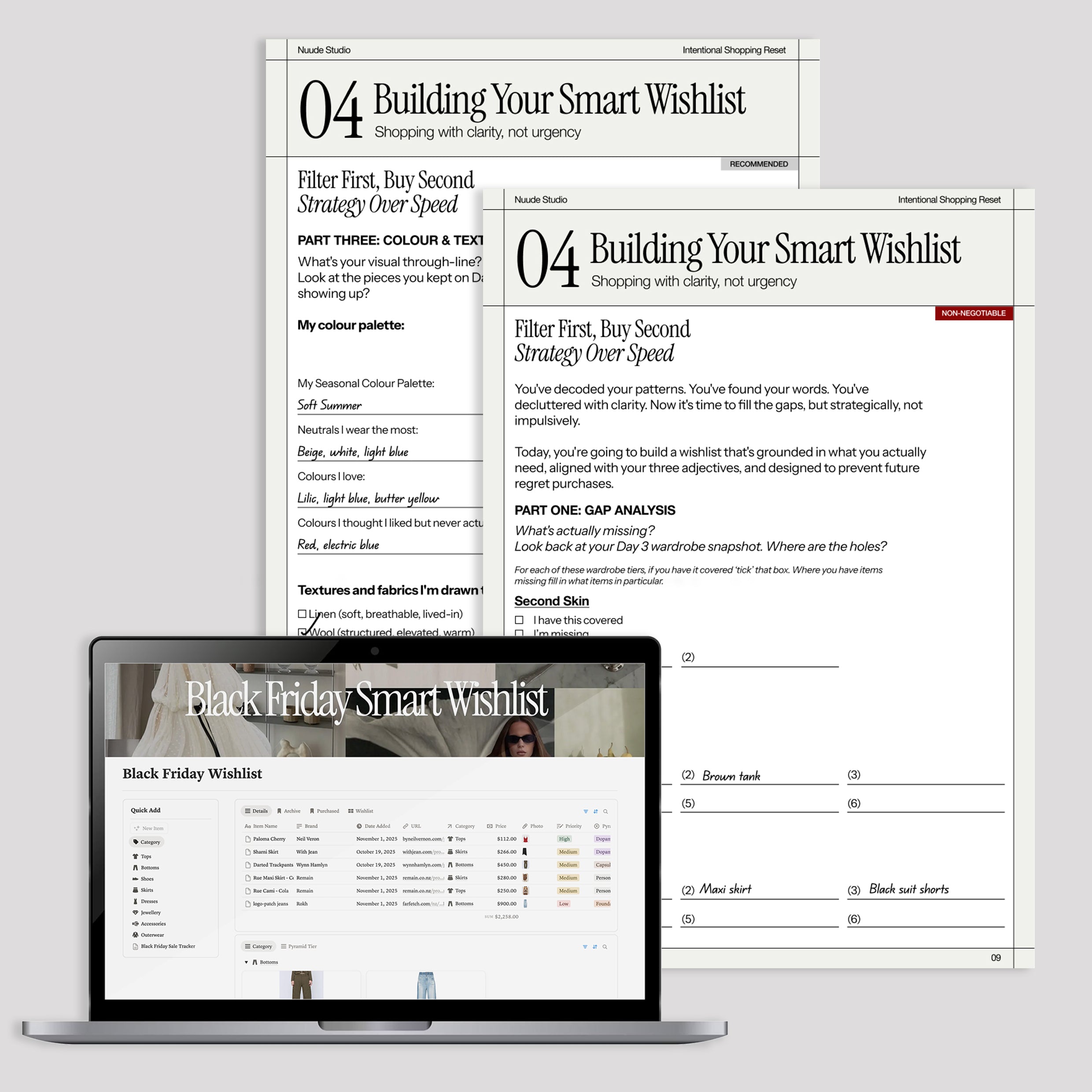 This reset works any time of year. While the Black Friday Sale Tracker is included as a bonus tool it can definitely be used outside of Black Friday. The core of this course is about understanding your shopping psychology and building a system that lasts forever. You'll use your three style adjectives, the Minimalist Wardrobe Formula, and the Notion wishlist system every single time you consider buying something -whether it's January, June, or Black Friday. The principles are timeless.